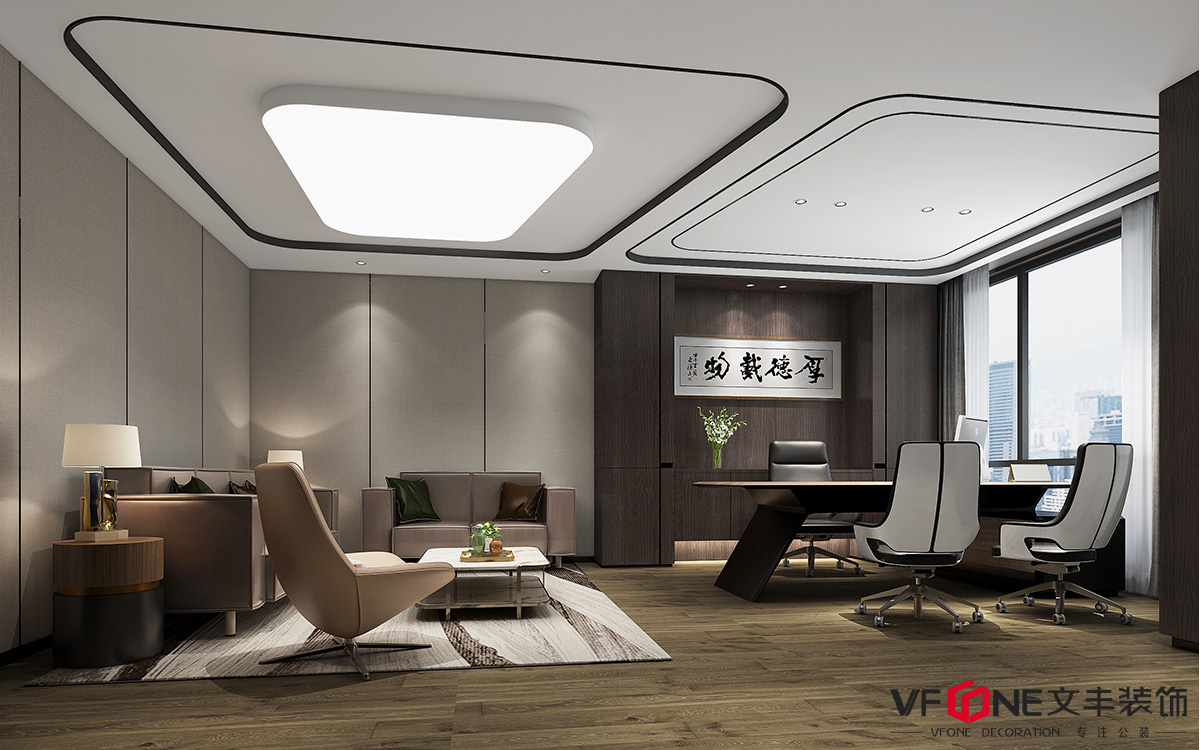 董事長(zhǎng)辦公室采用穩(wěn)重凝練的裝修風(fēng)格,整個(gè)空間內(nèi)沒(méi)有較大色差,造型相對(duì)保守,原有的大落地窗讓更多陽(yáng)光滲透于室內(nèi),強(qiáng)化了空間的透明性,給人以舒適明朗的感受,呈現(xiàn)出完美的現(xiàn)代、秀逸的中式裝修。