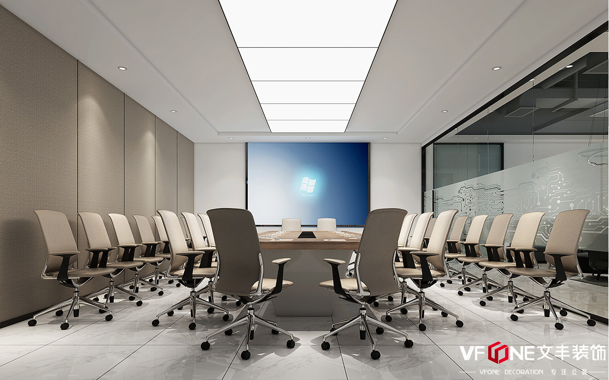會議室的玻璃隔墻貼上帶有電路圖案的玻璃磨砂紙,這是設(shè)計師為電子企業(yè)規(guī)劃的特色圖案,比專業(yè)更能說服人心的是細節(jié);長方形的桌子旁包圍配套的椅子,整齊劃一的顏色搭配和排列,讓整個空間看起來更加的穩(wěn)重。
