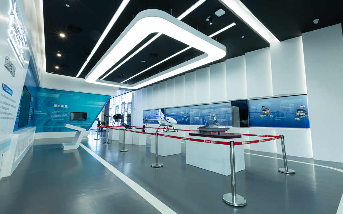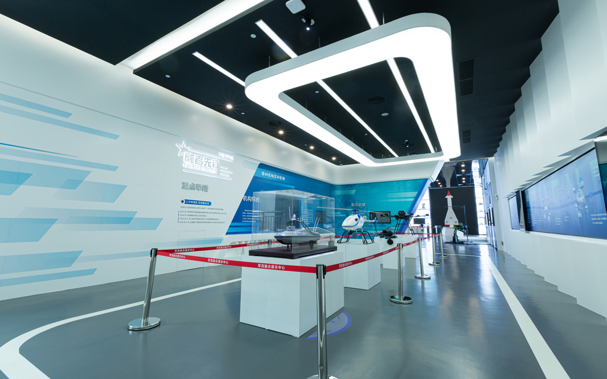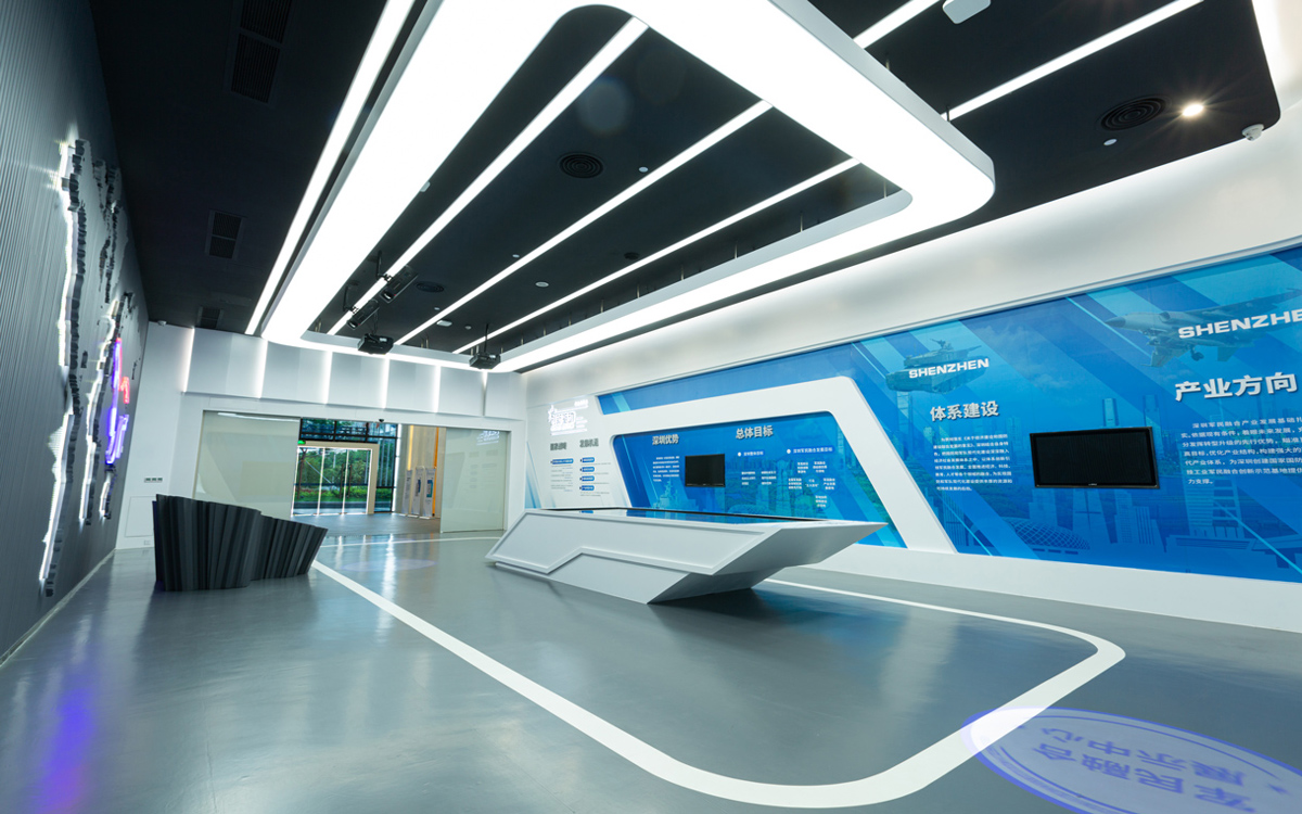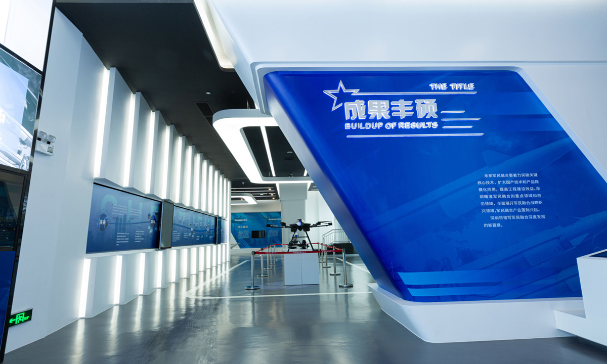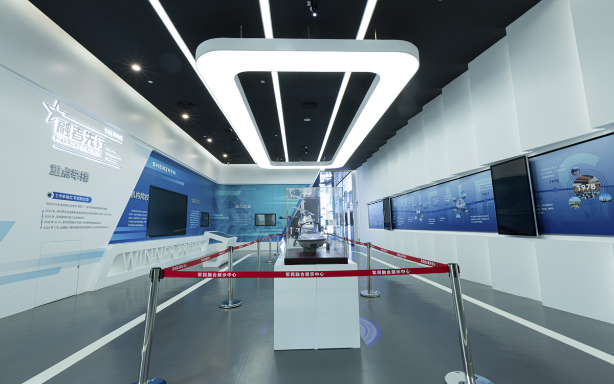 深圳公裝公司文豐裝飾設計師為軍民融合的設計方案是以展廳展示的產(chǎn)品文化和作用出發(fā),打造一個數(shù)字展廳特色的空間,將產(chǎn)品核心理念和展廳的設計主題相融合并表現(xiàn)出來。