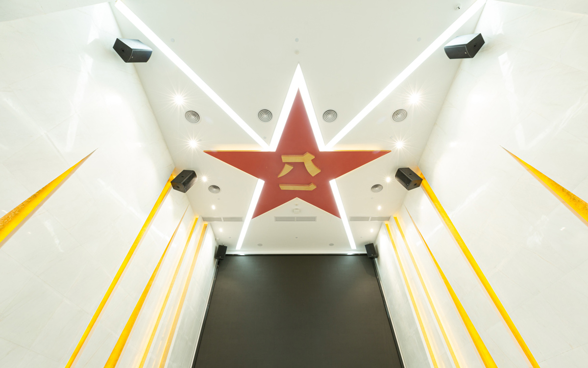序廳以紅色五角星作為中心吊頂,上綴“八一”兩字,象征中國人民解放軍,兩側(cè)對稱嵌入明黃色的反光帶,遠看就像冉冉升起的旗幟,不禁勾起我們的紅色回憶,令人肅然起敬。 酷似船狀的前臺以五星作為切入點,藍色硬朗線條作為點綴,搭配明黃耀眼的反光帶,讓人產(chǎn)生一種即將起帆前行的視線錯覺,妙哉!
