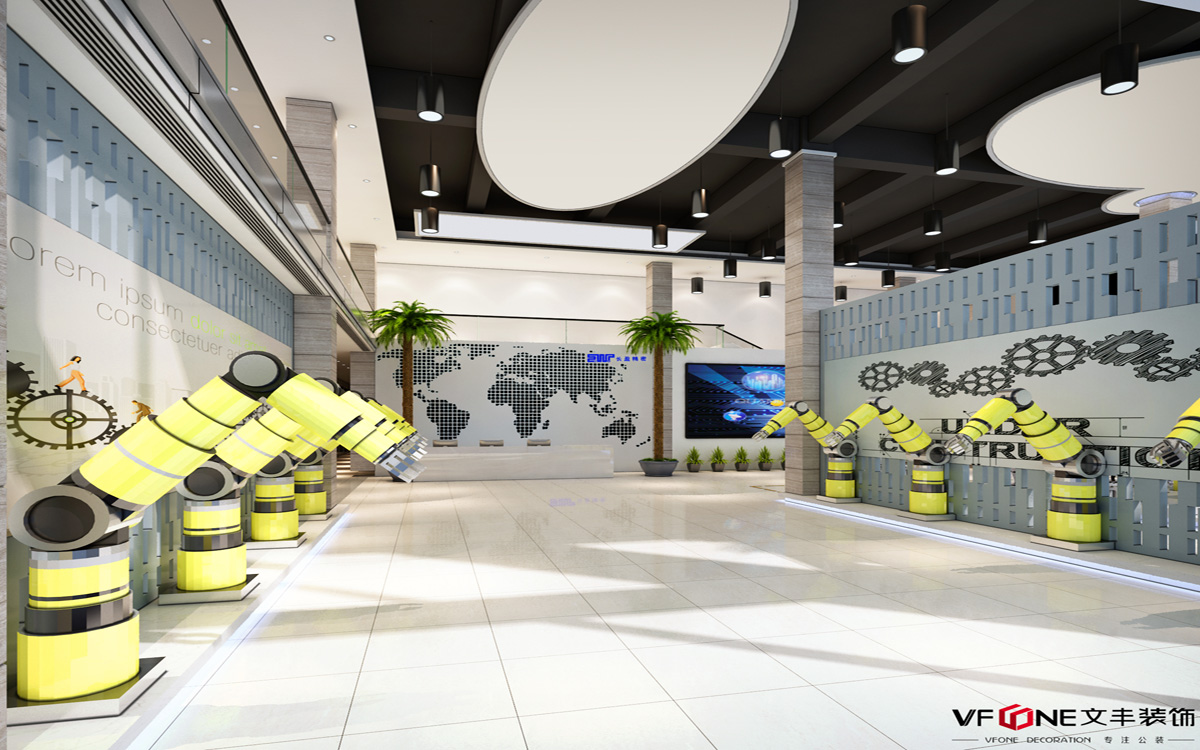 一樓整個空間中布設(shè)大量的機器人樣本,墻面上也設(shè)計了很多的機器齒輪狀。這不僅凸顯了科技公司的主題,充滿科技感和未來感。整個空間中各式各樣的橢圓形燈泡,多樣性的圖形讓整個空間變得更加多樣性。