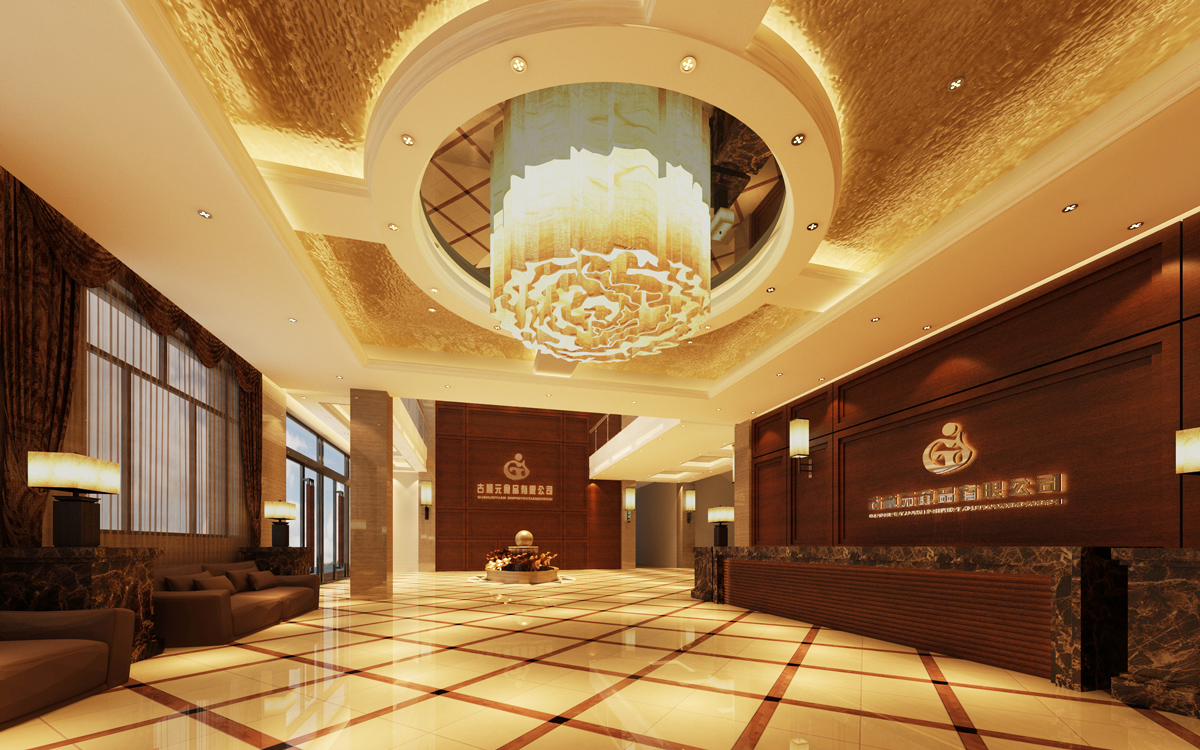 金黃色的裝潢,富麗堂皇。這是進到這家酒店的第一印象,天花頂是一個牡丹狀的雕塑,利用形狀的來進行空間光源的分配,再加上金黃色地板磚的反襯,整個空間眼前一亮。作品名稱:北京古順元酒店裝修設計作品