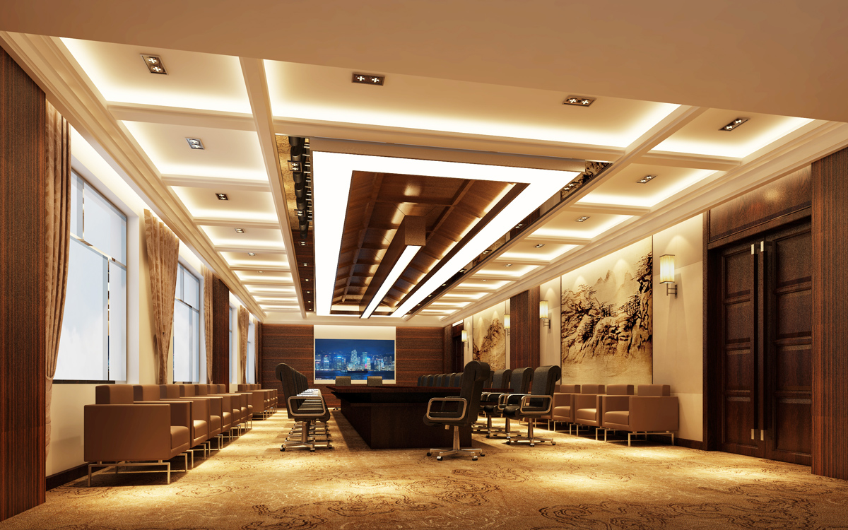 方方正正的的座椅穩(wěn)如泰山,是這個會議空間區(qū)別于其他空間的屬性。這樣的空間更加商業(yè)化。兩幅山水畫是這個空間的的特色,花紋的地毯并沒有擾亂這個空間的格調(diào),并且與之相合。