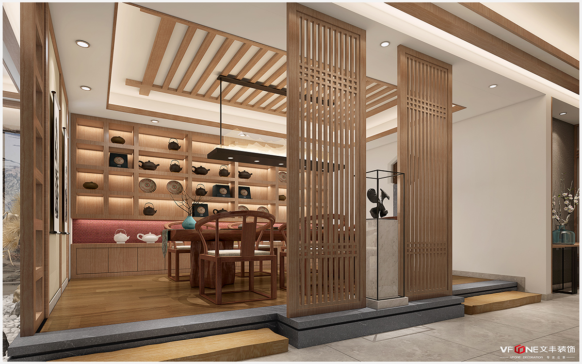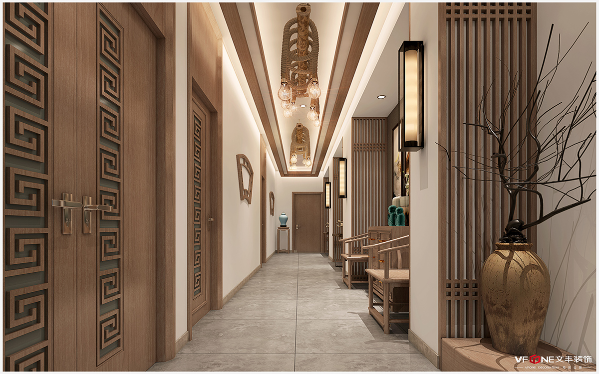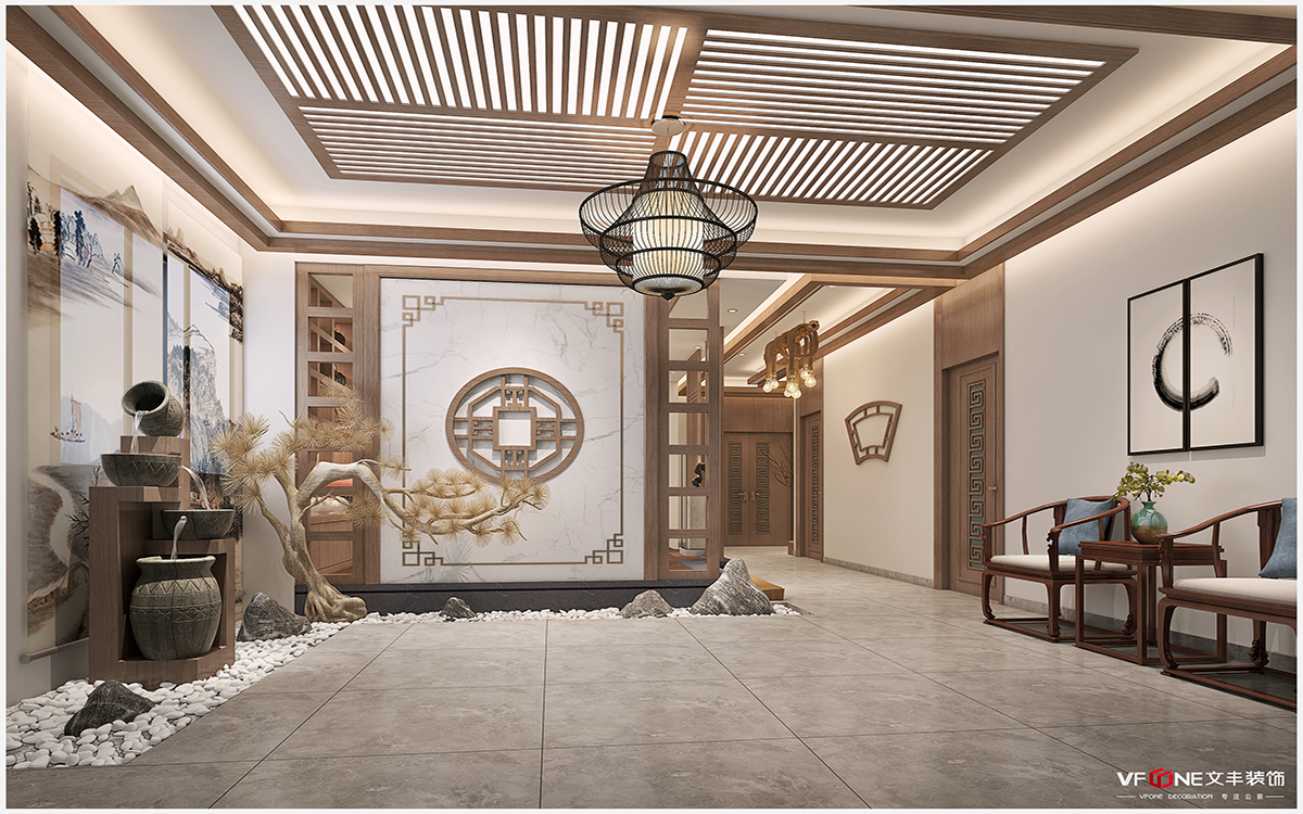 在文豐設(shè)計師的精心構(gòu)思刻畫下,玄關(guān)設(shè)計中大片的簡約白與古典文化建筑造型相結(jié)合,雅韻清香的門窗雕飾,精致大氣的燈籠吊飾,古樸美觀的造型鋪設(shè),加上潺潺流水碧荷,無一處不帶有濃郁的古韻色彩和時尚魅力的現(xiàn)代藝術(shù)線條。