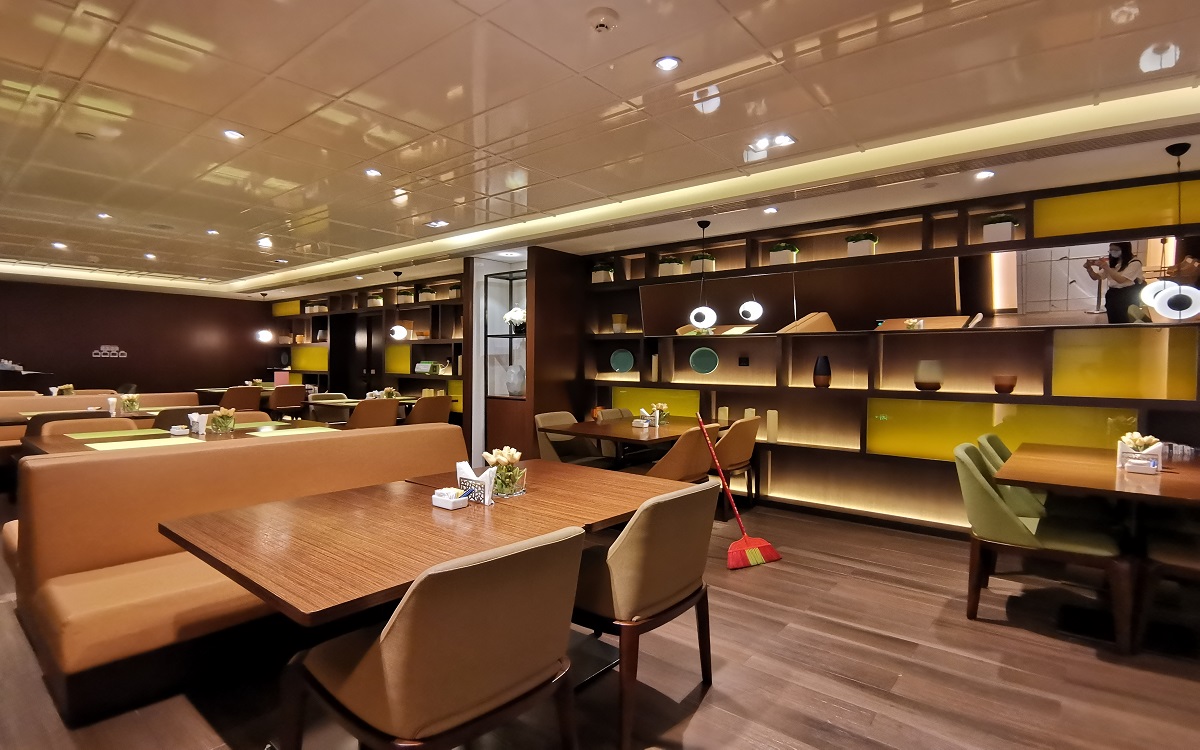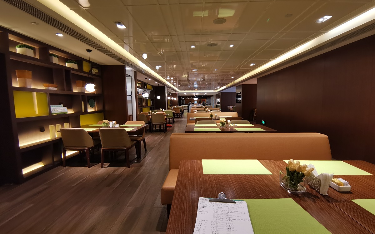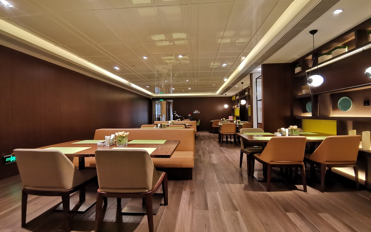 餐廳內(nèi)部主體使用鋼材與實(shí)木結(jié)合的空間結(jié)構(gòu),大量運(yùn)用了互補(bǔ)色,色調(diào)統(tǒng)一又各有微妙,在暖色燈光的烘托下,既增添了空間的層次感,又營造出舒適放松的氛圍。