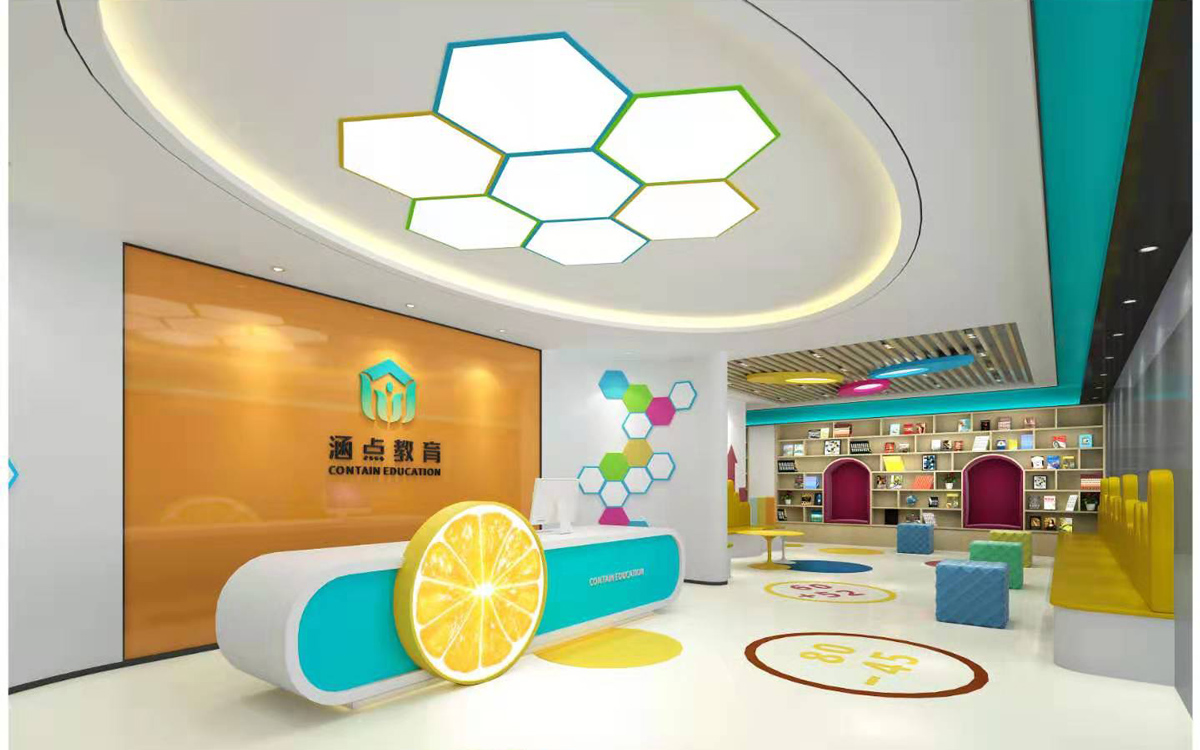 前臺代表著培訓機構(gòu)的門面,在設(shè)計時我們公司會特別注意,本案例中以醒目的橙色形象墻作為背景,并鑲嵌機構(gòu)的logo;前臺的巨大檸檬圖案作為點綴,讓人印象深刻。在燈光的設(shè)計上,為防止光污染,設(shè)計師摒棄眩光,因為眩光會刺激兒童的視覺,影響兒童視覺神經(jīng)的發(fā)育。