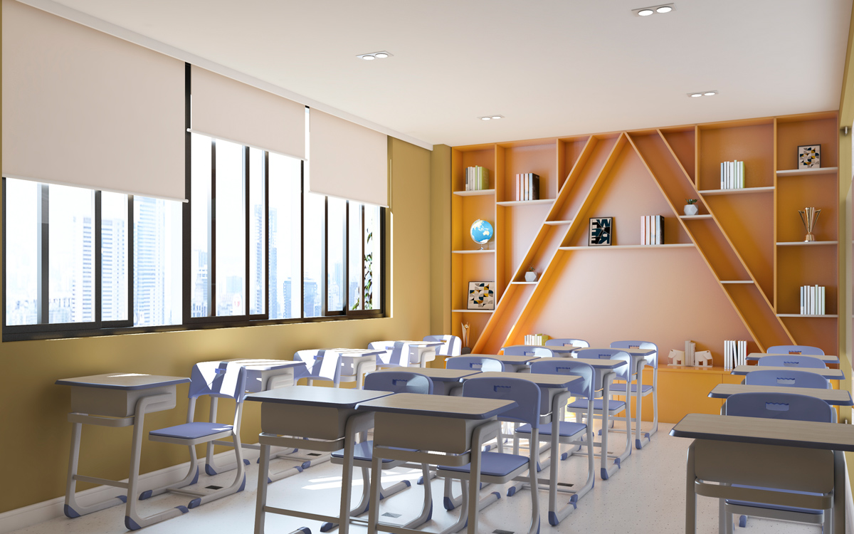 教室的設(shè)計上,采用了淡雅、明快的天藍色、綠色與粉色,在考慮環(huán)境的功能性以及采光同時,使室內(nèi)空間美觀、整潔、舒適、富有情趣,并營造出具有兒童特點的文化藝術(shù)氛圍。
