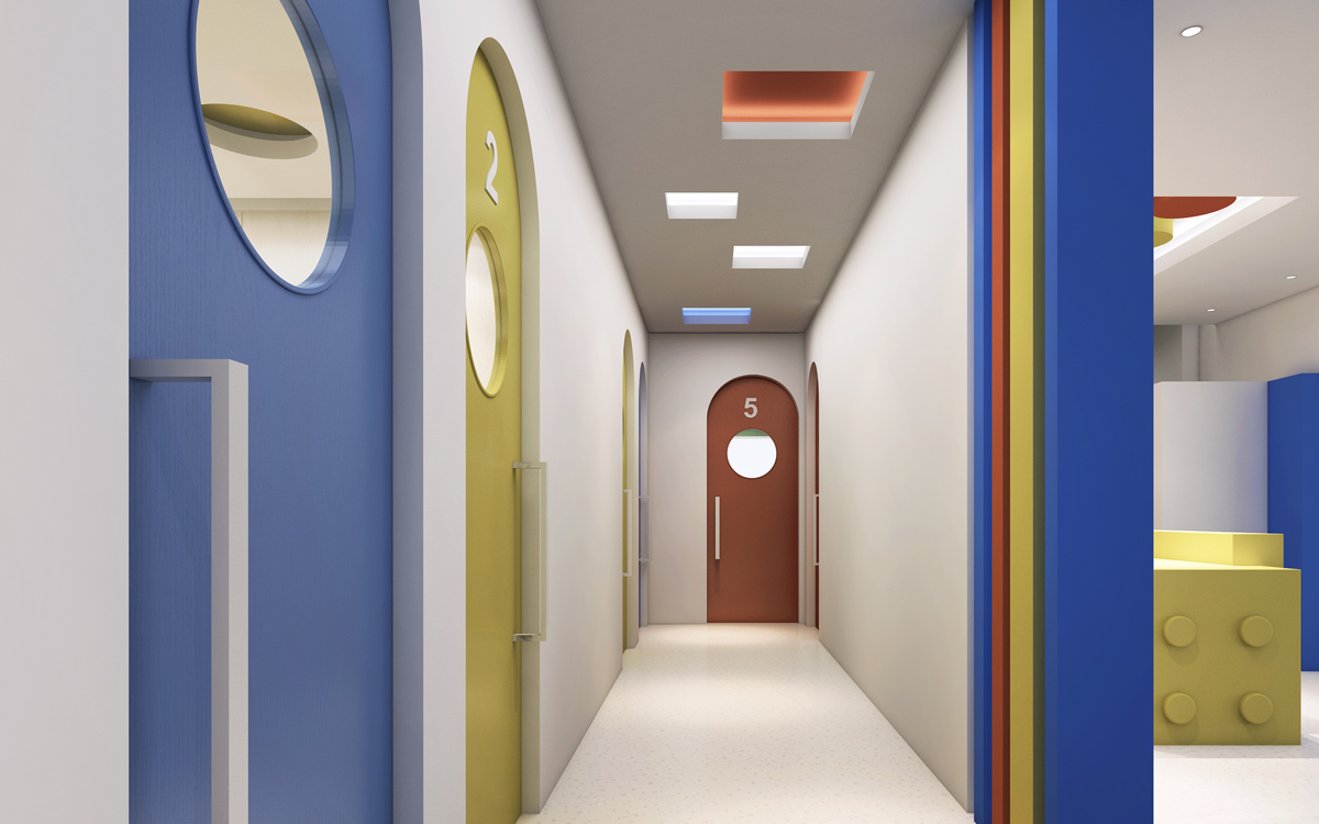 設(shè)計(jì)師將空間中使用的柱子、門等結(jié)構(gòu)以三種不同的顏色進(jìn)行渲染,達(dá)到空間視覺統(tǒng)一。黃橙藍(lán)三種高飽和度的顏色讓整個(gè)空間猶如積木屋一般,趣味十足。