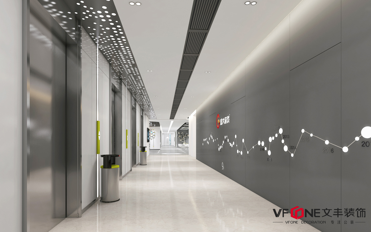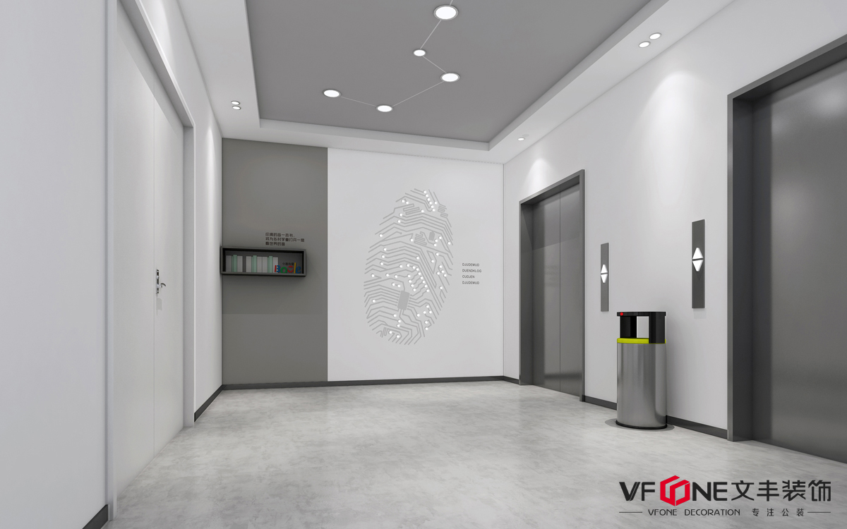 長廊上如心電圖般跳動的折線是計算機與互聯(lián)網(wǎng)漫長的演變歷史,北斗七星與指紋的結(jié)合是科技與人的融合,無論是電梯間還是副電梯間,都以充滿科技感的設(shè)計語言,呼應(yīng)了現(xiàn)代人對于未來辦公的想象,讓空間與時間相互交融。
