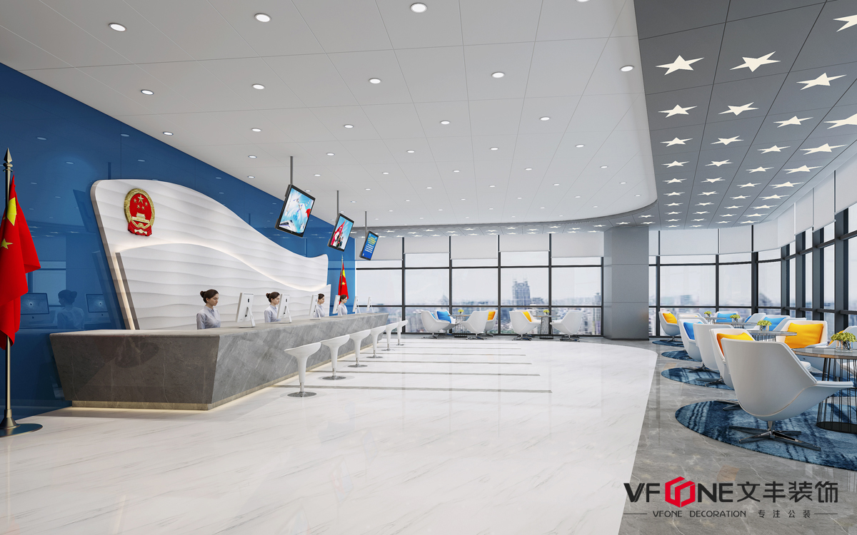 文豐設計師在廣闊的天地中找尋靈感,服務大廳的設計從海洋、天空、水、宇宙中提取出了最純凈的深海藍為背景,在金色的船錨的指引下,潔白的艦船在洶涌的海浪中砥礪前行,點點繁星不卑不亢,多種元素互相融合,符合新時代的大背景,表現出一種美麗、冷靜、理智、安詳與廣闊、永不言棄的品格與精神。