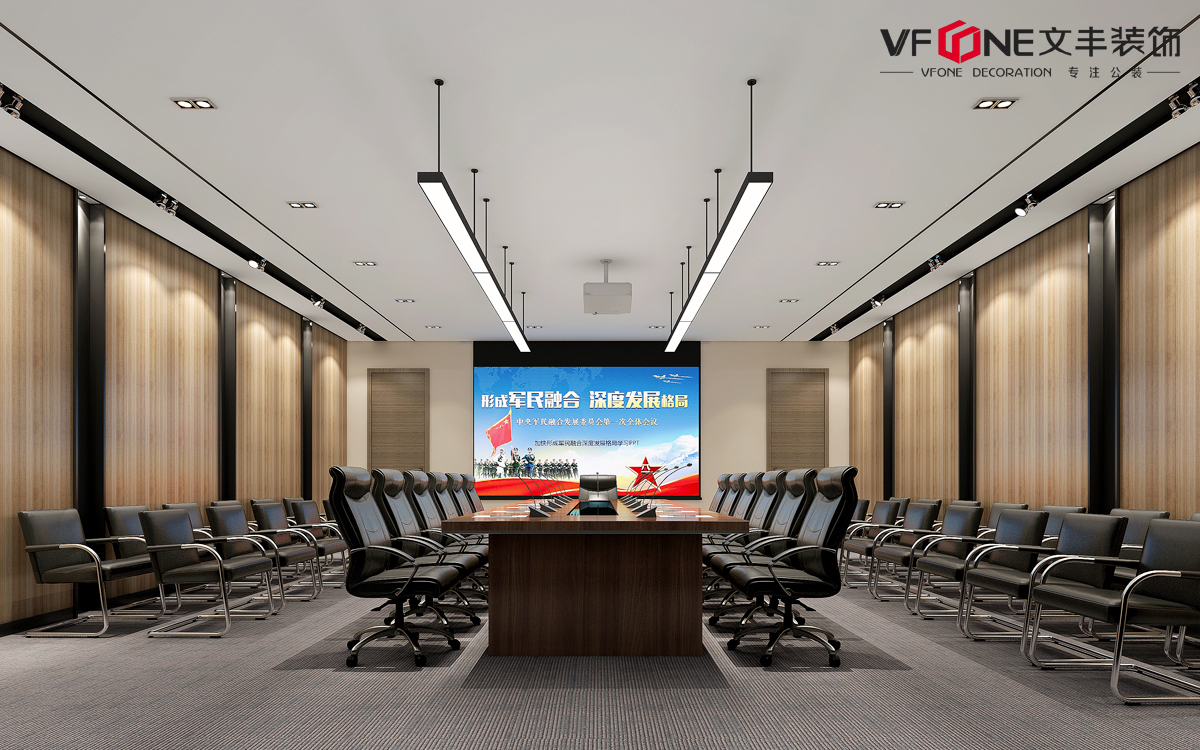 會議室以正式化會議所需要的風格去設計,使用灰、黑組合,并運用白色燈光來制造出良好的采光性,突出現代、統(tǒng)一、穩(wěn)健、嚴謹,運用視覺設計手段和先進材料與科學施工技術相結合,打造完善的建筑結構和感觀效果。