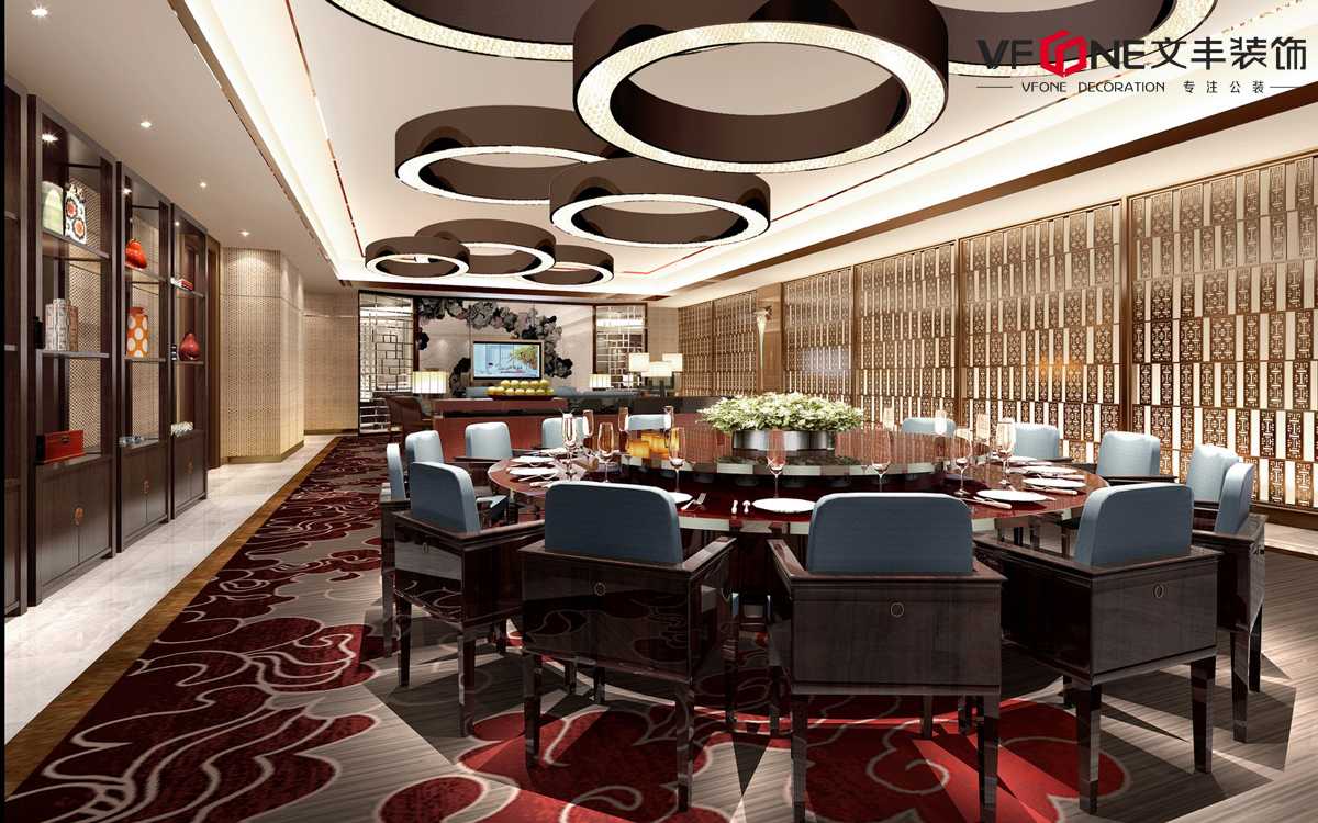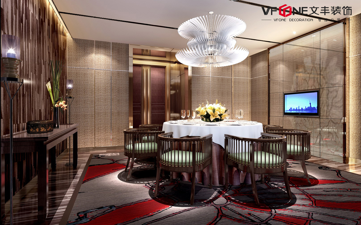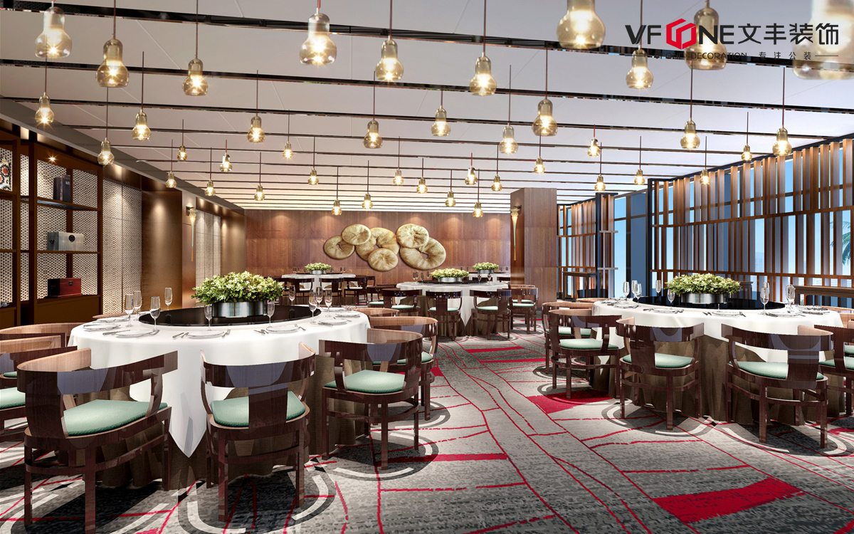 恰到好處的燈光環(huán)境往往令人感到松弛自在,充滿食欲。燈光設(shè)計中,不同類型的燈具點綴,讓天花成為視覺的重點之一,提升空間格調(diào)氛圍;色彩上避免過度的大面積跳躍色彩,可以延續(xù)酒店主色調(diào),落實在墻面、地面、天花上,與主色調(diào)產(chǎn)生一定的對比關(guān)系,產(chǎn)生色彩層次感,令空間色彩整體統(tǒng)一中充滿和諧的變化。