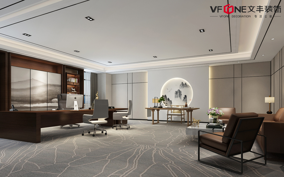 糅雜著現代與傳統(tǒng)的設計因素,體現了其辦公空間的高貴、大氣。木材、山水掛畫、富具中式特色的裝飾等,與空間相互映襯,是企業(yè)實力與藝術碰撞的結果,讓公司員工與來訪客戶感受到辦公室尊貴的環(huán)境。