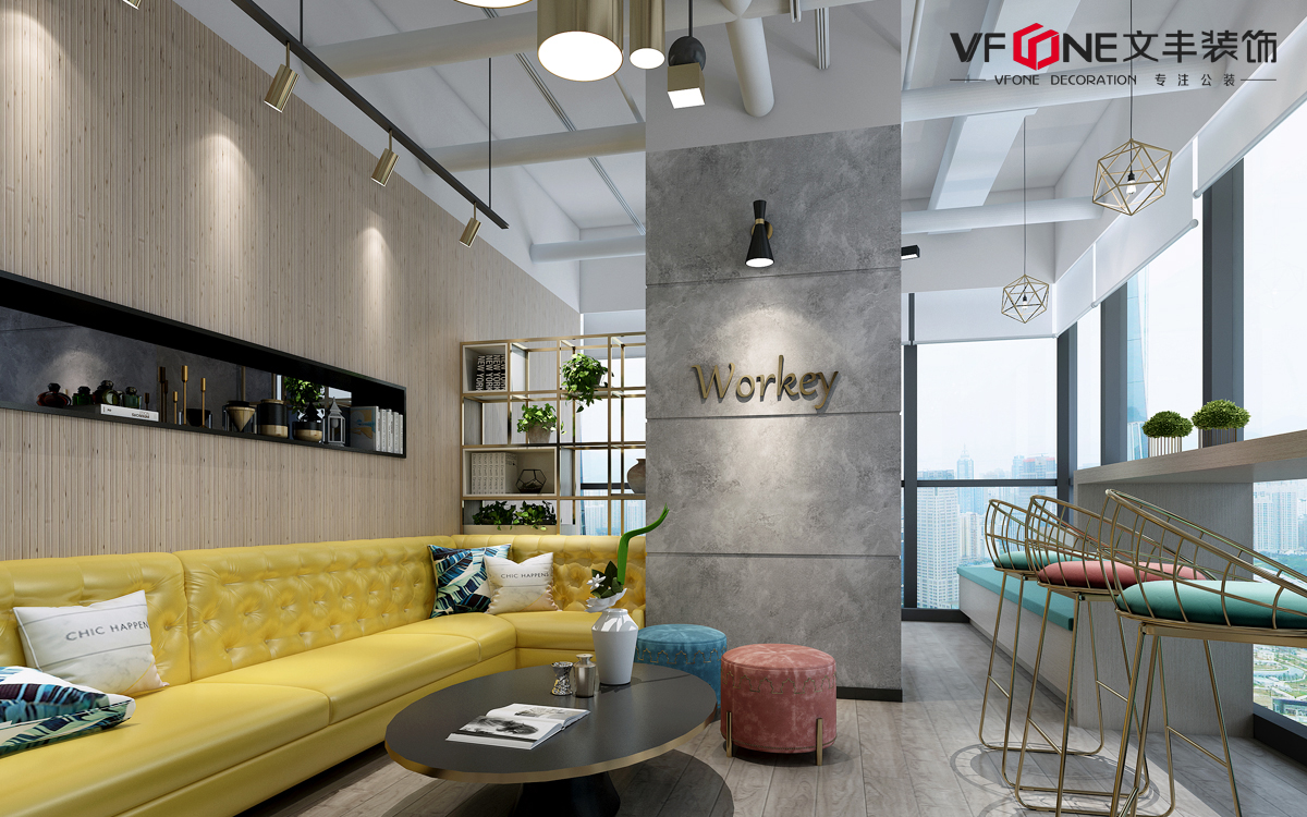 休息區(qū)整體采用黃色家具、燈具、墻面等裝飾,溫暖的色調(diào)營造了一個(gè)溫馨的休閑空間,不規(guī)則的燈具造型也增添了空間的趣味性,讓上班工作成為一種享受。整個(gè)辦公空間以舒適體驗(yàn)為基調(diào),以情懷風(fēng)格為方向,與時(shí)尚設(shè)計(jì)相結(jié)合,打造出一個(gè)面朝大海,春暖花開的多元化網(wǎng)紅辦公空間,讓你上班都會(huì)忘記回家!