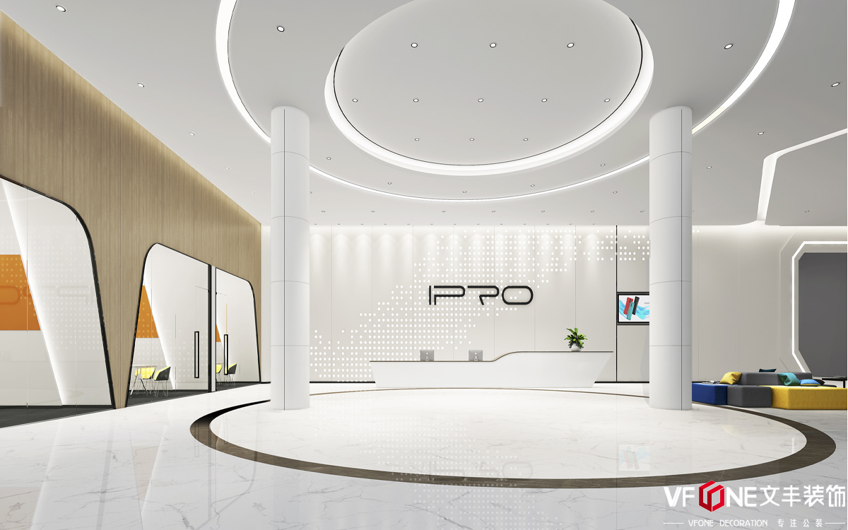 前廳設計兩種不同樣式的坐席,提高整個空間實用性的同時也提高空間的多樣性。同心圓的天花與地面圓環(huán)形瓷磚對稱,中間以兩根柱子進行鏈接,凸顯前臺,整個空間高端大氣。前臺區(qū)用綠植進行裝點,將環(huán)保的觀念深入到空間設計理念中;前臺上方裝飾點面結合的科技鏈條,體現企業(yè)的科技屬性。 深圳辦公設計裝修